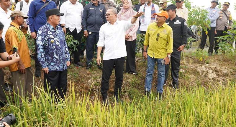 Turun ke sawah didampingi Gubernur H Muhidin, Menko Bidang Pangan, Zulhas meninjau hamparan padi yang tengah menguning, artinya siap panen.