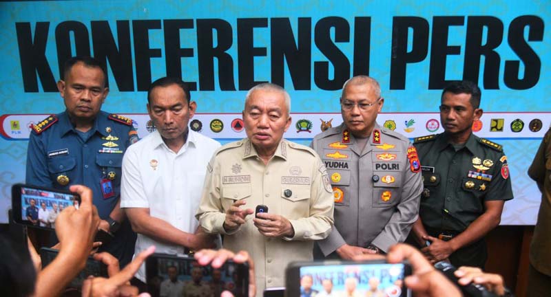 GUBERNUR Kalimantan Selatan, H Muhidin didampingi Kapolda Kalsel, Irjen Pol Rosyanto Yudha Hermawan dan Kabinda Kalsel, Brigjen Pol Nurullah saat menyampaikan keterangan usai Rakor kesiapsiagaan menghadapi bencana Karhutla tahun 2025.