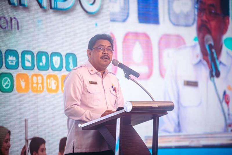 Plt Asisten Bidang Pemerintahan dan Kesra Setdaprov Kalsel, Dr HM Muslim saat menyampaikan sambutan tertulis Gubernur Kalsel pada pembukaan jambore kader Posyandu bidang kesehatan tahun 2025 di Banjarmasin