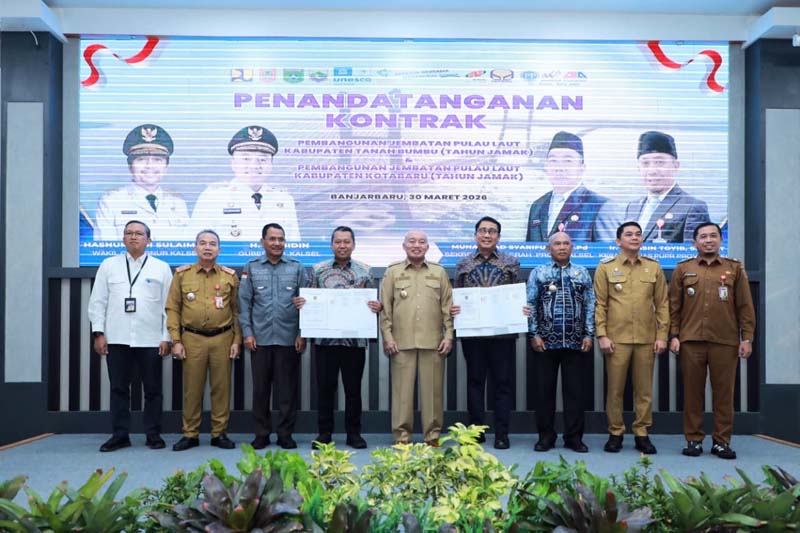 BANJARBARU – Gubernur Kalimantan Selatan H Muhidin didampingi Ketua DPRD H Supian HK dan Sekda M Syarifuddin menyaksikan Penandatangan Kontrak Pembangunan Jembatan Penghubung Daratan Kalimantan-Kabupaten Tanah Bumbu-Pulau Laut-Kabupaten Kotabaru (Tahun Jamak), di Aula Kantor Dinas Pekerjaan Umum dan Penataan Ruang (PUPR) Kalsel, Senin (30/3).