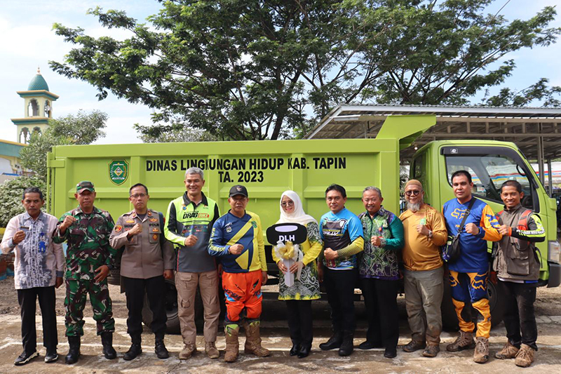 PJ Bupati Tapin M Syarifuddin berfoto bersama usai menyerahkan bantuan armada sampah dari dinas lingkungan hidup kepada Pemerintah Desa Salam Babaris.
