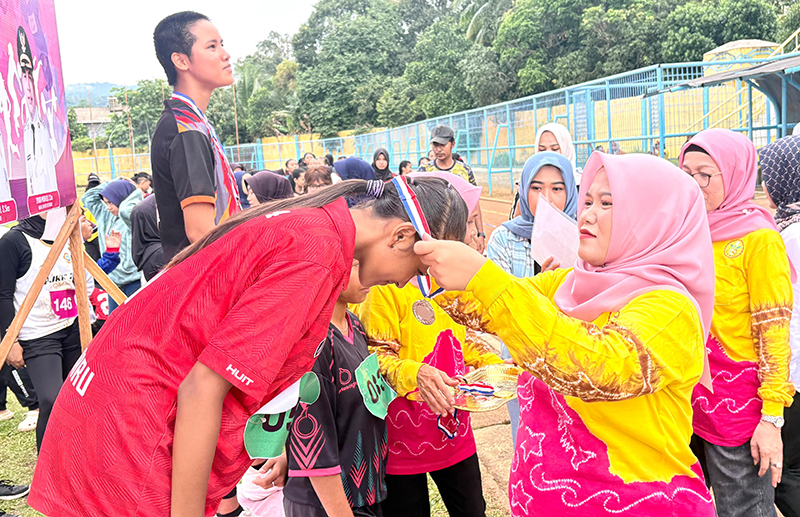 PENASIHAT Perwosi Kotabaru Suci Anisa Rusli saat mengalungkan medali kepada salah satu pemenang Kejuaraan Atletik Wanita Tingkat SMP/SMA Sederajat dan Perguruan Tinggi di Lapangan Stadion Bamega, Minggu (14/12).