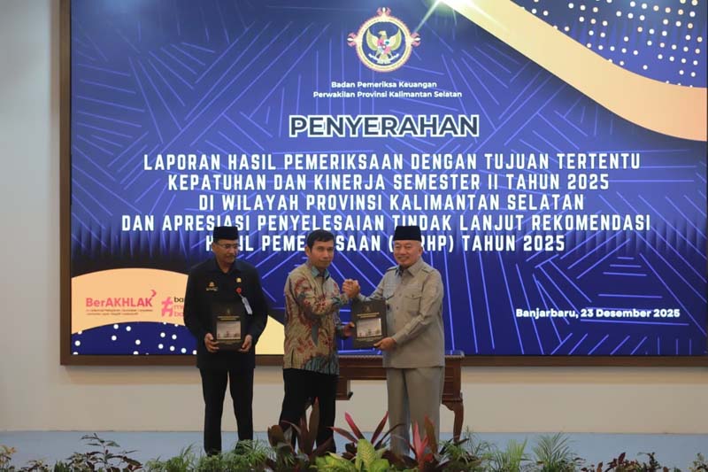 Gubernur Kalimantan Selatan, H Muhidin saat menerima laporan pemeriksaan dengan tujuan tertentu kepatuhan dan kinerja semester II tahun 2025 di wilayah Provinsi Kalimantan Selatan dan apresiasi penyelesaian tindak lanjut rekomendasi hasil pemeriksaan (TLRHP) tahun 2025 dari Kepala BPK RI Perwakilan Provinsi Kalsel, Andriyanto