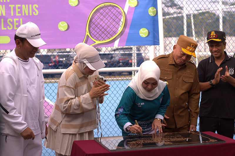 Ketua Tim Penggerak PKK Provinsi Kalimantan Selatan, Hj Fathul Jannah menandatangani prasasti sebagai tanda diresmikannya lapangan tenis di kawasan Kantor Badan Intelijen Negara Daerah (BINDA) Kalimantan Selatan, di Banjarbaru, tampak disaksikan Gubernur Kalsel, H Muhidin