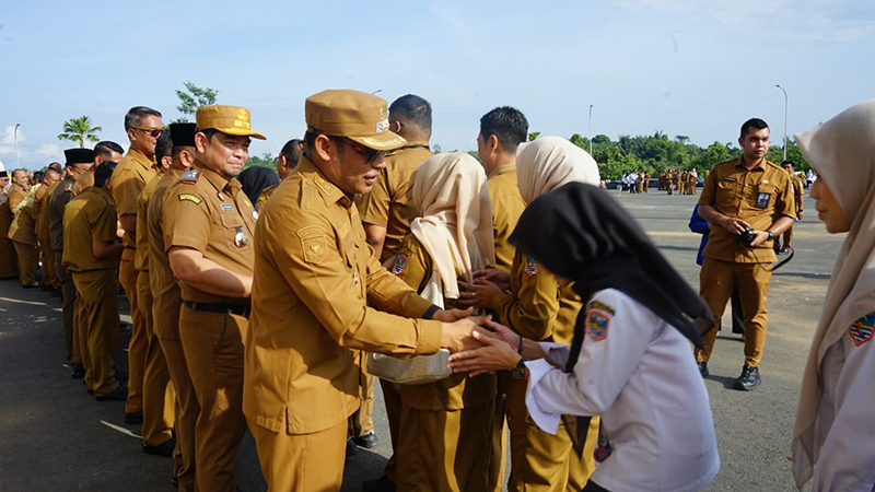 WABUP Kotabaru Syairi Mukhlis bersalaman dengan ASN di lingkungan pemkab setempat usai apel pagi, Senin (30/3).